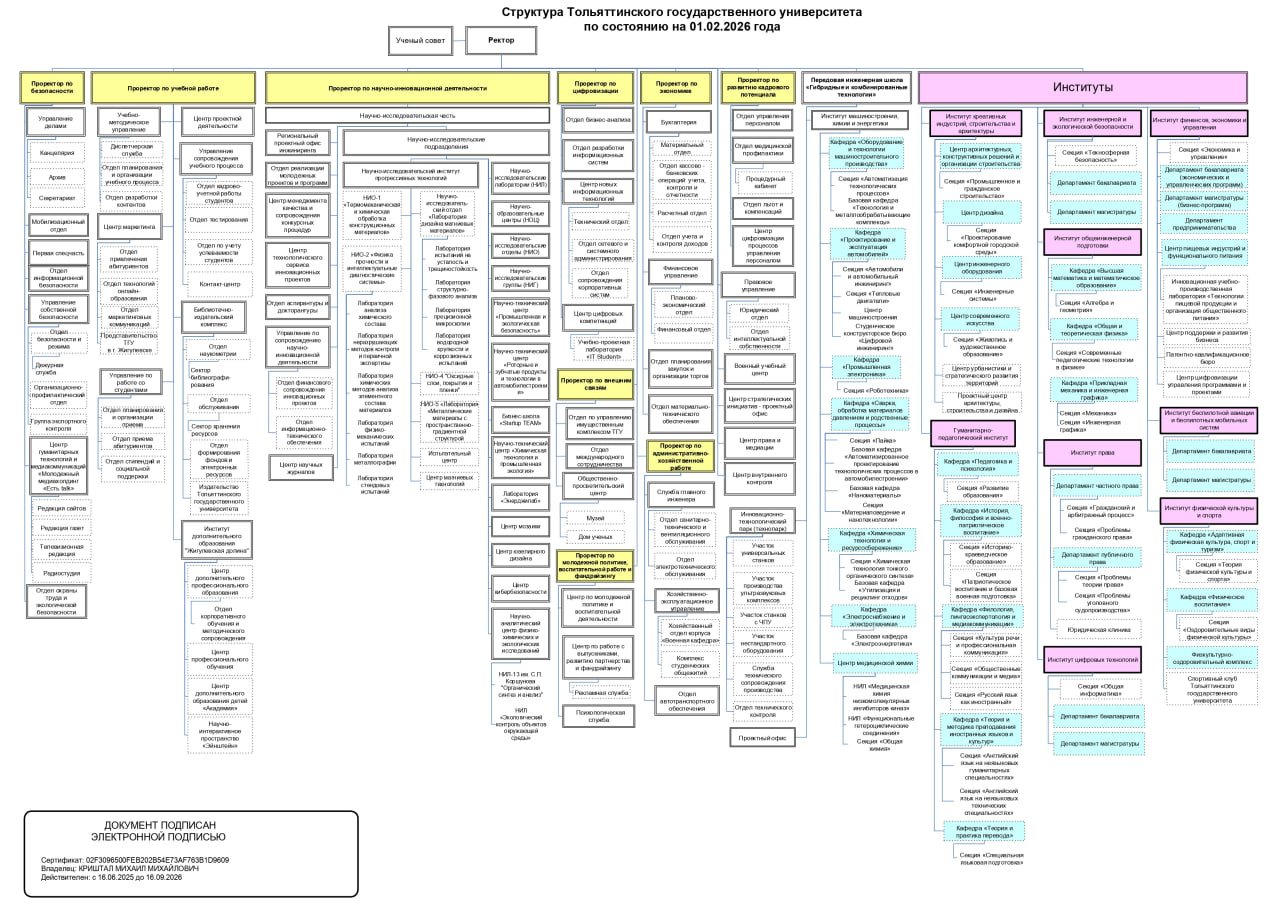 | Ректорат | Криштал Михаил Михайлович | Ректор, председатель учёного совета | 445020, Самарская область, г. Тольятти, ул. Белорусская, д. 14, каб. 239 | https://www.tltsu.ru/ about_the_university/management/ rectorate |